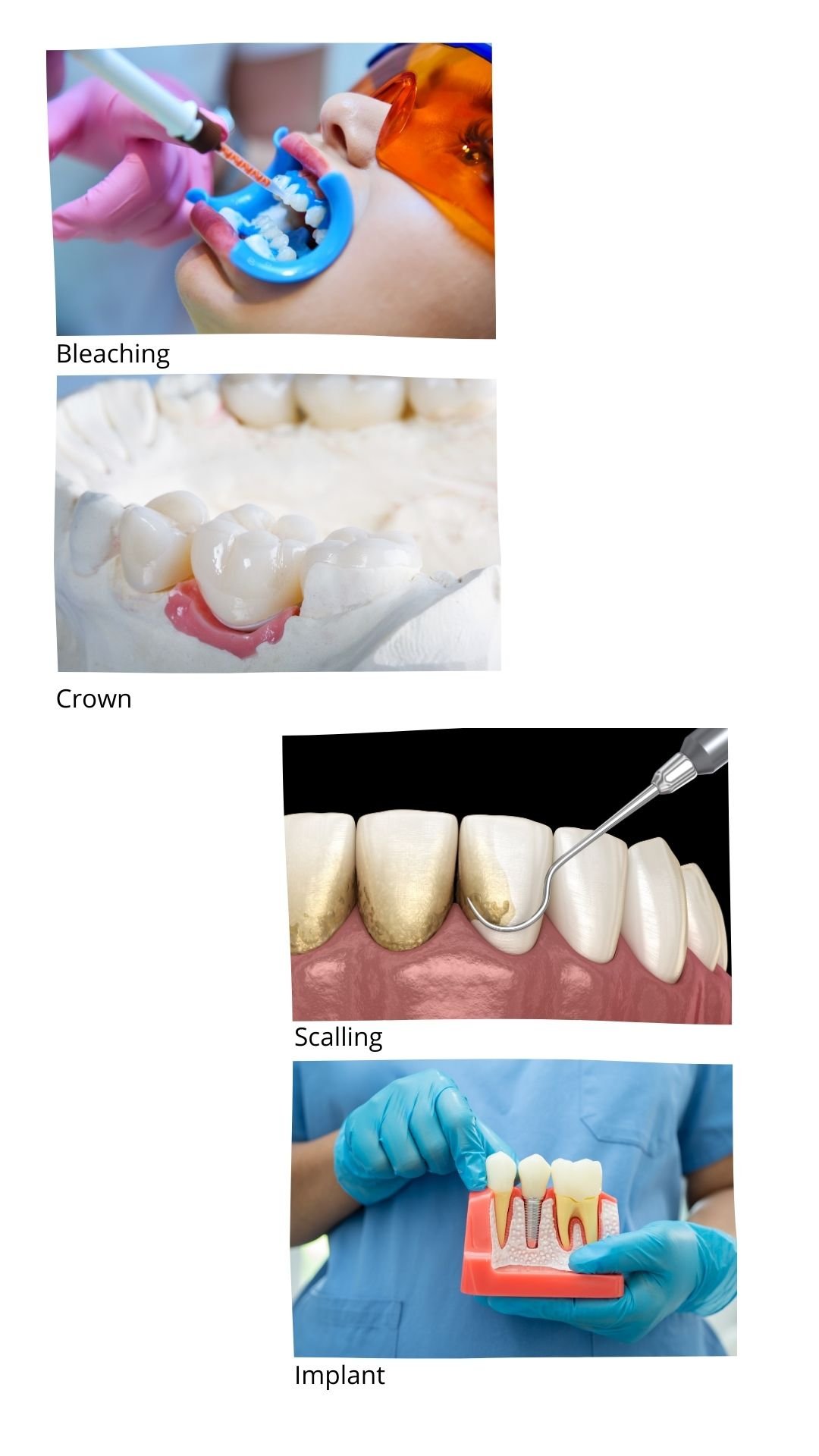 The services starts from Root Canal Treatment, Filling, Veneer, Bleaching, Denture, Crown, Implant, Curretage, Splinting, Replantation, Gingivectomy, Alviolectomy, Scalling, Odontectomy, Mucocel Extirpation, Tooth Extraction and Orthognatic.